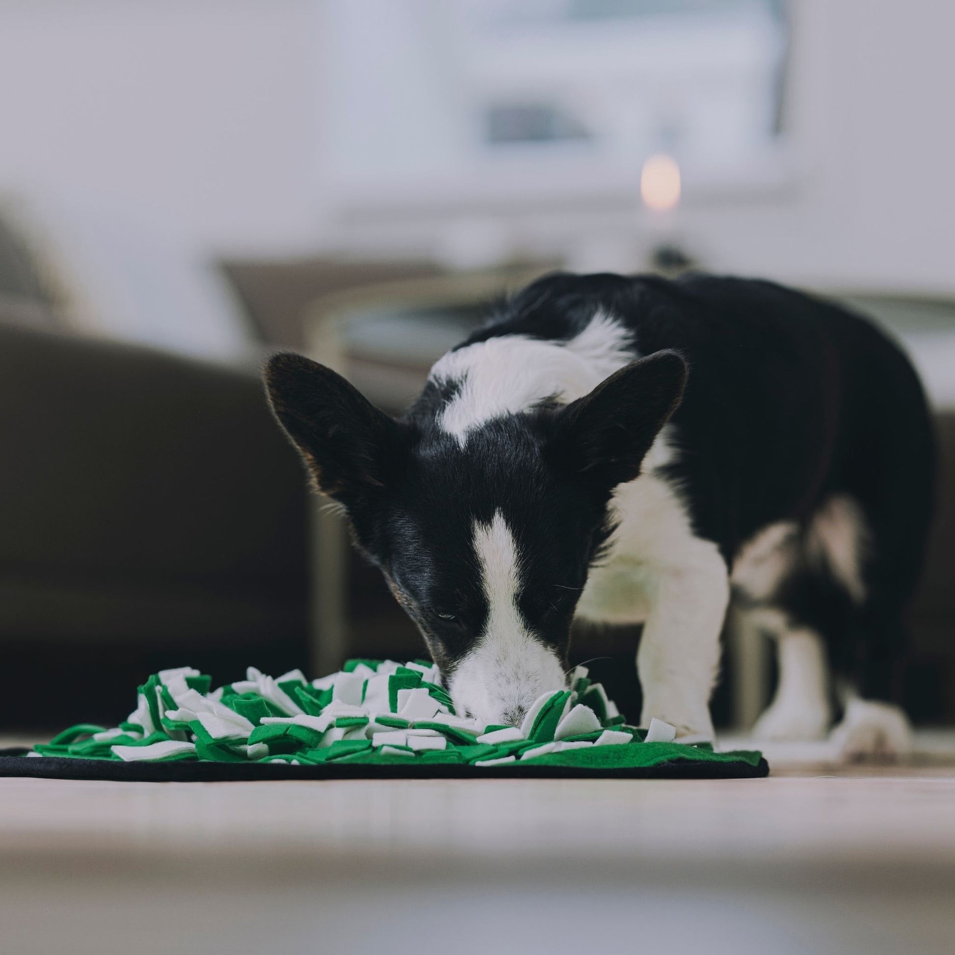Gem godbidder eller foder mellem stoffolderne og læg måtten på gulvet. Din hund vil følge duften og nyde en rolig og fokuseret søgeopgave — perfekt til regnvejrsdage eller stille stunder derhjemme.